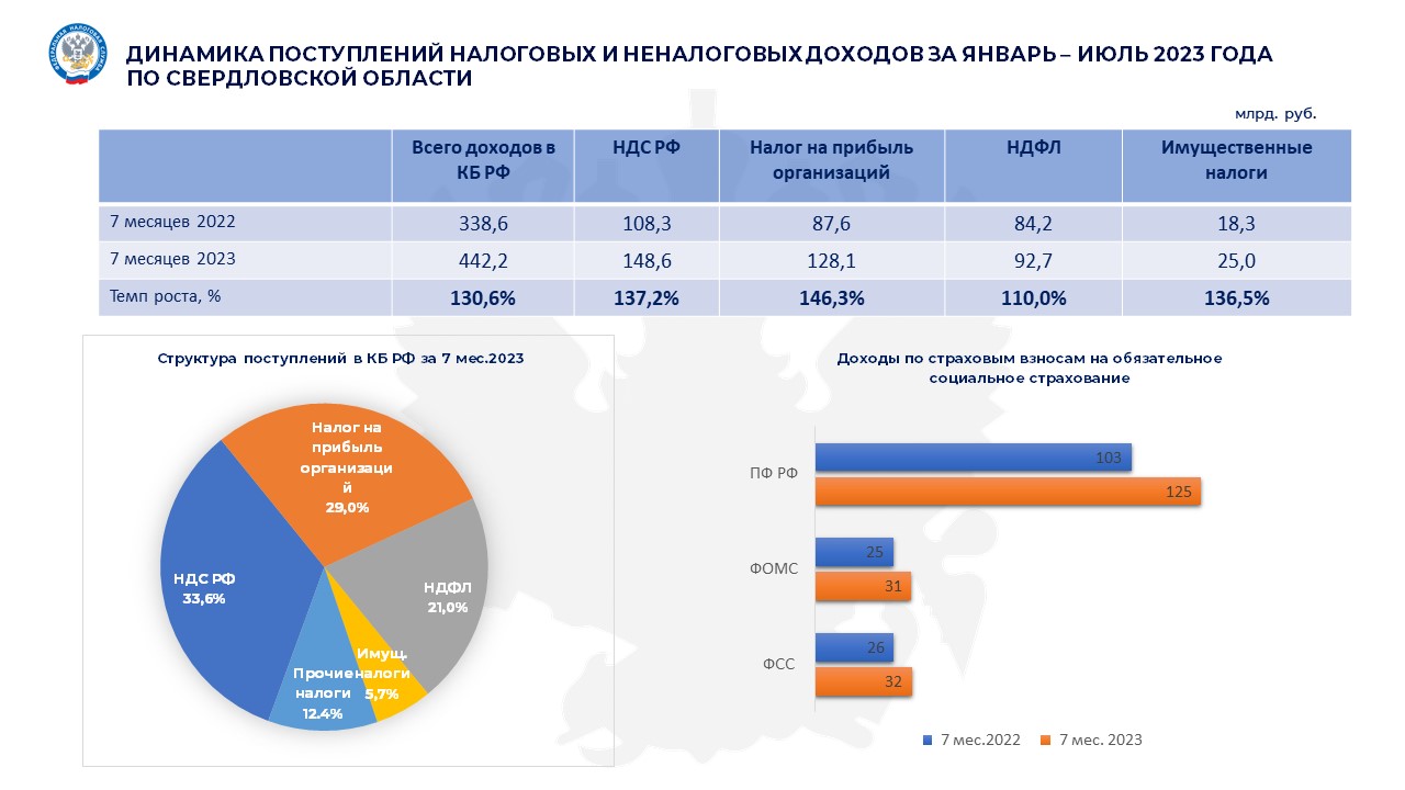 По итогам работы за январь-июль 2023 года с территории Свердловской области в консолидированный бюджет Российской Федерации поступило администрируемых ФНС доходов 442,2 млрд рублей, что на 30,6% или на 103,6 млрд рублей больше поступлений аналогичного периода прошлого года.