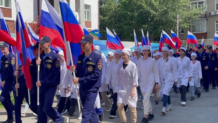 В честь главного государственного праздника в Свердловском областном медицинском колледже прошел флэшмоб. Студенты-медики в белых халатах, студенты-спасатели в синей форме и волонтеры Красного Креста в алых жилетках выстроились в цвет российского триколора. Таким нетривиальным образом сотрудники и студенты колледжа отметили День России.