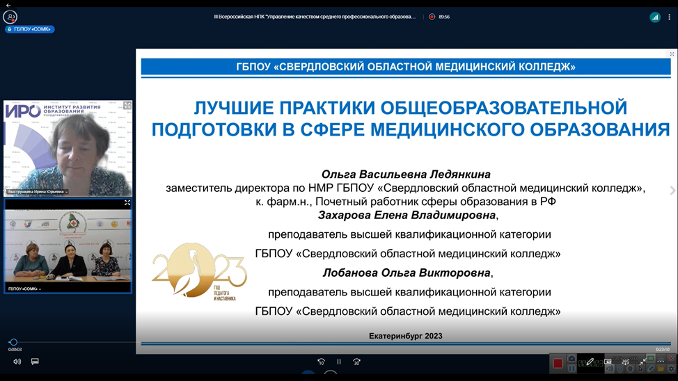 Промежуточные итоги работы Федеральной пилотной площадки «Апробация и внедрение федерального пакета методических разработок для обновления практики подготовки по общеобразовательным дисциплинам с учетом профессиональной направленности программ среднего профессионального образования, реализуемых на базе основного общего образования» были представлены коллективом авторов: заместителем директора колледжа по НМР Ольгой Васильевной Ледянкиной, преподавателями общеобразовательного цикла колледжа Еленой Владимировной Захаровой и Ольгой Викторовной Лобановой в рамках доклада «Лучшие практики общеобразовательной подготовки в сфере медицинского образования».