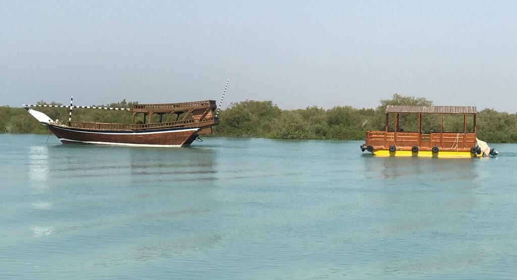 Мангровый лес ХараС вершин надо бы спуститься на воду: как-никак находимся на берегу Персидского залива с лазурной водой. Поездка на моторных лодках в плавучий мангровый лес Хара (самая уникальная природная достопримечательность острова) стала просто именинами сердца.