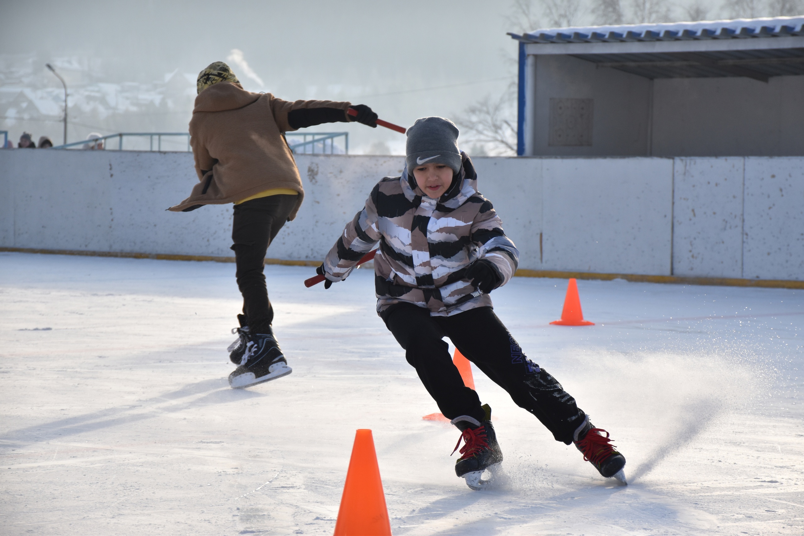 Эстафета на льду состояла из четырех этапов. Ребята соревновались в беге на коньках, передавая друг другу эстафетную палочку, пытались управиться с хоккейной клюшкой и шайбой, перемещали импровизированные снежки в огромном подсачеке, и переправляли товарищей по команде на бублике. Кроме того, рядом с кортом проходили еще две активности: валенкомет и меткобол. В первой из них участники должны были как можно дальше метнуть валенок, а вторая активность очень напоминала керлинг.