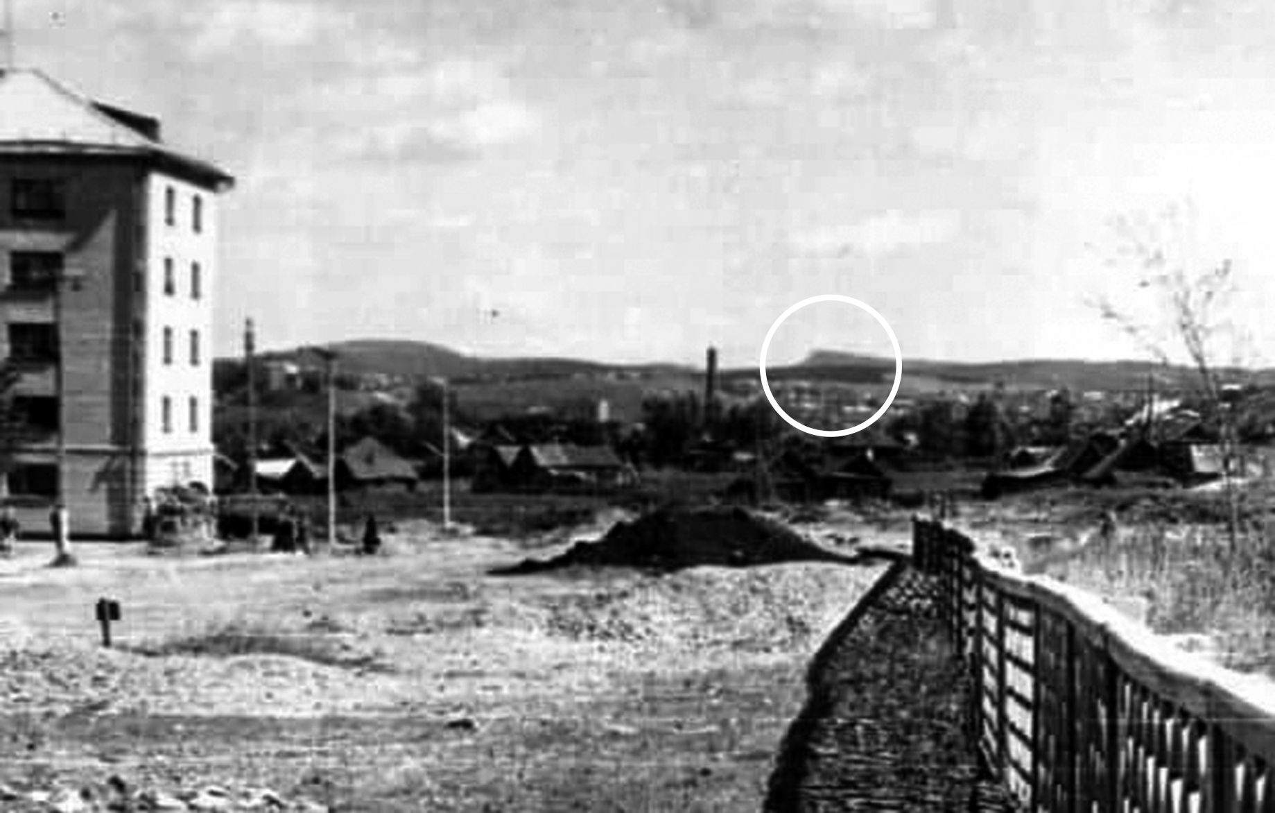 Фотография интересна еще одной деталью, на которую сразу и внимания не обратишь. В центре на горизонте виднеется гора Змеевая. Она находилась в четырех километрах восточнее Ревды близ южного берега Волчихинского водохранилища. Этой горы уже нет, все ее скальные отложения пошли на щебень и сопутствующие строительные материалы, разработку начали с 1981 года открытым способом. Сейчас это карьер около дороги на Дегтярск. Кстати, когда заработал каменно-дробильный завод, это место стали называть «пьяной горой». Может, потому, что рабочие карьера злоупотребляли спиртным.