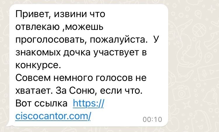 Граждане получают сообщение от якобы знакомого им человека (но на самом деле аккаунт пользователя взломан) с просьбой проголосовать за сына, дочь, племянника, к примеру, на школьном конкурсе,