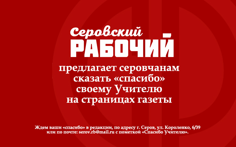 Газета «Серовский рабочий», поддерживая акцию, предлагает серовчанам сказать «спасибо» своему Учителю на страницах газеты. В течение 2023 года мы готовы предоставить слово всем, кто захочет рассказать о своих учителях, педагогах и наставниках. Истории (желательно, с фото) будут размещены и на сайте, и в наших группах в соцсетях. Ждем ваши «спасибо» в редакции или по почте: [email protected] c пометкой «Спасибо Учителю».