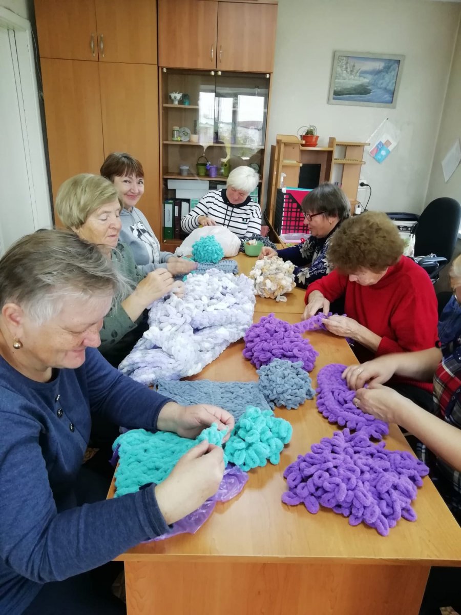 На занятиях мастерицы вяжут из плюшевой пряжи повязки на голову, удобные тапочки, нарядные шапочки, плед и другие изделия.